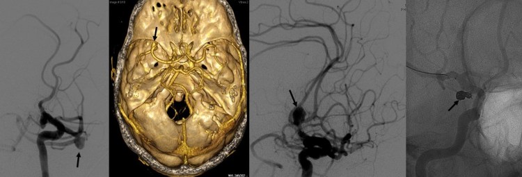 - Aneurismas cerebrales: Representan la causa más frecuente de hemorragia subaracnoidea espontánea (75-80% de los casos). Se trata de dilataciones de las arterias debidas a la debilidad en la pared de las mismas. Ello provoca que pueda tener lugar la ruptura de la arteria con la consiguiente hemorragia. La frecuencia de aneurismas cerebrales en la población se sitúa en torno a un 1-5%. En caso de ser diagnosticados inmediantamente tras una hemorragia subaracnoidea deben ser tratados tan pronto como sea posible para minimizar el riesgo de resangrado. En otras ocasiones tiene lugar el diagnóstico de aneurisma cerebral en pacientes asintomáticos sin que se haya producido la ruptura del mismo. En estos casos ha de valorarse la posibilidad de tratar el aneurisma de forma preventiva para evitar que en un futuro tenga lugar la hemorragia subaracnoidea. Tanto en un caso como en otro, el tratamiento puede llevarse a cabo de forma endovascular, mediante cateterismo cerebral, o bien mediante cirugía la cual permite el clipaje y cierre definitivo del aneurisma. La decisión sobre el tratamiento y la elección de una técnica u otra va a depender fundamentalmente de la localización del aneurisma, sus relaciones anatómicas con las ramas arteriales afectadas, el tamaño de mismo, la edad y condición clínica de cada paciente.