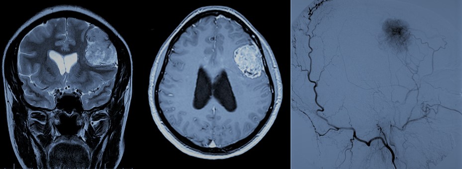 –Meningiomas: Se trata del tumor cerebral benigno más frecuente. Su origen se sitúa en una de las capas meningeas que rodean el cerebro, en concreto la aracnoides. En un 90% de los casos los meningiomas corresponden al grado I de la clasificación de la Organización Mundial de la Salud (en adelante OMS) lo que les confiere un comportamiento biológico benigno. Muy raros en niños, son más frecuentes en mujeres aumentando su incidencia conforme avanza la edad. En caso de presentar síntomas, crecimiento progresivo o efecto compresivo sobre las estructuras intracraneales es preciso su tratamiento, generalmente quirúrgico. Los casos menores de 3 cm y con una localización profunda pueden beneficarse de la Radiocirugía. Aquellos casos con un diagnóstico incidental (los encontrados de forma inesperada debido a una prueba de imagen motivada por otra causa) sólo precisarán tratamiento en menos de un tercio de los casos, permaneciendo el resto estables y asintomáticos.