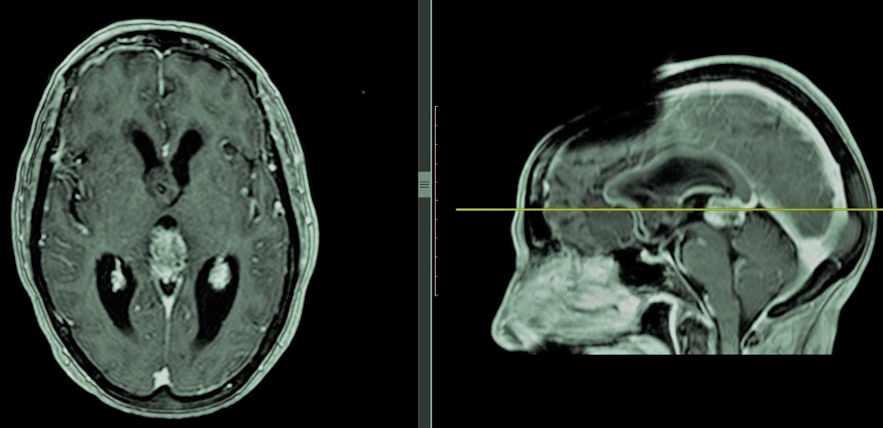 -Tumores pineales: Tienen lugar en la glándula pineal o epífisis situada en la parte posterior del diencéfalo y relacionada con la producción de melatonina y con los ciclos de sueño-vigilia. Al igual que sucede con los craneofaringiomas, los tumores pineales aunque típicos en niños, tienen lugar también en adultos. Existen una gran variedad de estirpes de tumores pineales que pueden exhibir grados de agresividad muy variados. En niños los más frecuentes son de tipo germinal (germinomas, sobre todo, y menos frecuentes coriocarcionas, carcinomas embrionarios, tumor de seno endodérmico y teratomas maduros/inmaduros), mientras que en adultos suelen tratarse de gliomas o meningiomas. Estos tumores suelen manifestarse con el llamado Síndrome de Parinaud, una incapacidad para dirigir la mirada hacia arriba en ocasiones acompañada de hidrocefalia obstructiva aguda e hipertensión intracraneal. En estos casos además de llevar a cabo cirugía sobre el tumor puede ser preciso una intervención previa para el tratamiento de la hidrocefalia. La necesidad de tratamiento con quimio o radioterapia está determinado, al igual que el pronóstico, por la estirpe del tumor.