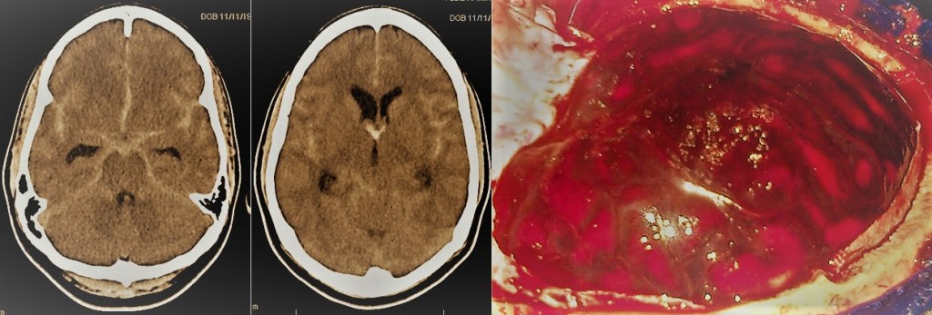 - Hematoma subdural agudo: Tiene lugar por debajo de la duramadre, la capa meníngea más superficial. Se encuentra por tanto en íntimo contacto con el cerebro. A diferencia de los anteriores, suelen presentarse en adultos generalmente mayores, lo que unido a su proximidad con el cerebro les confiere un peor pronóstico. En caso de alcanzar un volumen crítico o dar lugar a una alteración neurológica debe plantearse la evacuación quirúrgica.