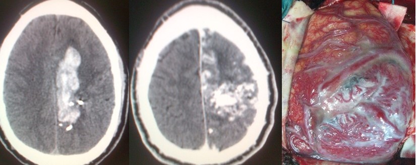 - Contusión cerebral hemorrágica: Se trata de lesiones hemorrágicas dentro del cerebro como consecuencia de un traumatismo. Pueden aparecer o aumentar de tamaño de forma diferida, principalmente en las primeras 48-72 horas. En caso de alcanzar un volumen crítico o dar lugar a una alteración neurológica, debe valorarse la evacuación quirúrgica.