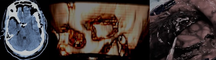 - Fracturas de la base del cráneo: Afectan comúnmente al peñasco temporal, región clival o fosa craneal anterior. En las fracturas del peñasco es frecuente la aparición de otorragia (salida de sangre a través del oído), así como la parálisis facial y la pérdida de audición. Todas ellas pueden asociar fístula de líquido cefalorraquídeo. Suelen deberse a traumatismos craneoencefálicos graves de manera que en ellas pueden producirse lesiones graves a nivel del parénquima cerebral o tronco del encéfalo así como afectación de los principales vasos sanguíneos cerebrales.
